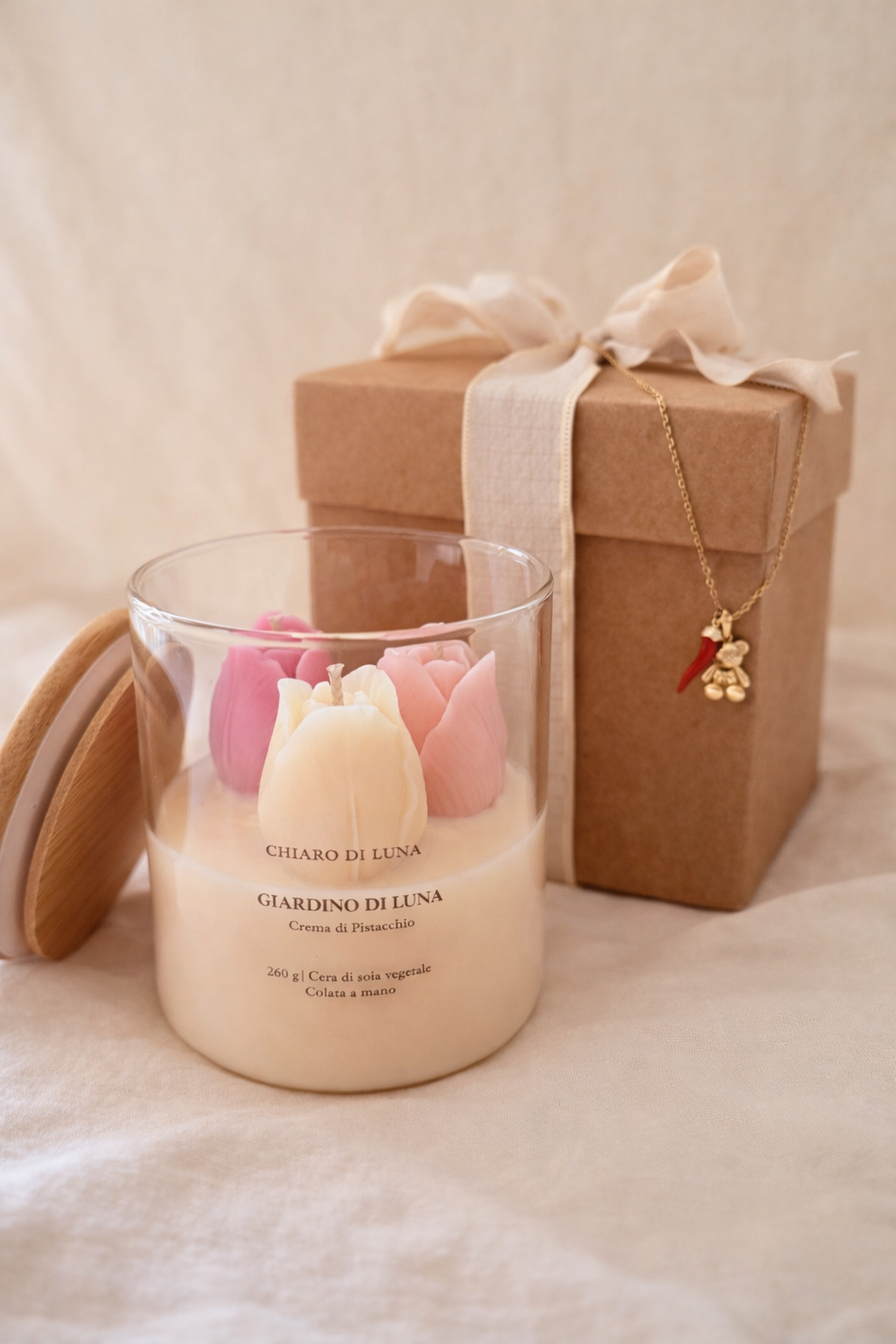 Giardino di Luna è una candela artigianale colata a mano, decorata con fiori e realizzata con cura in ogni dettaglio.