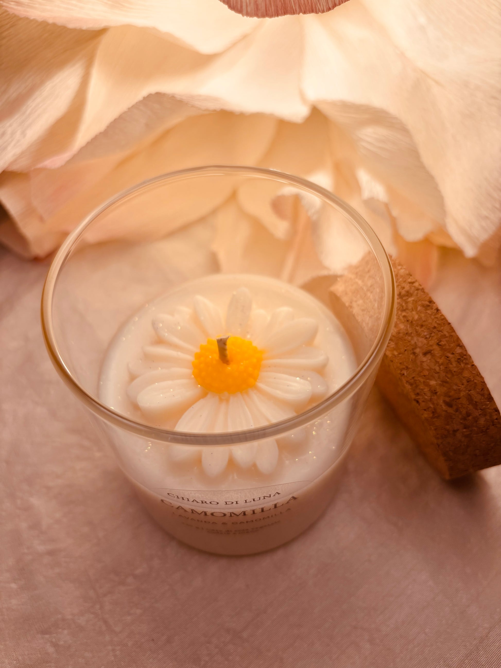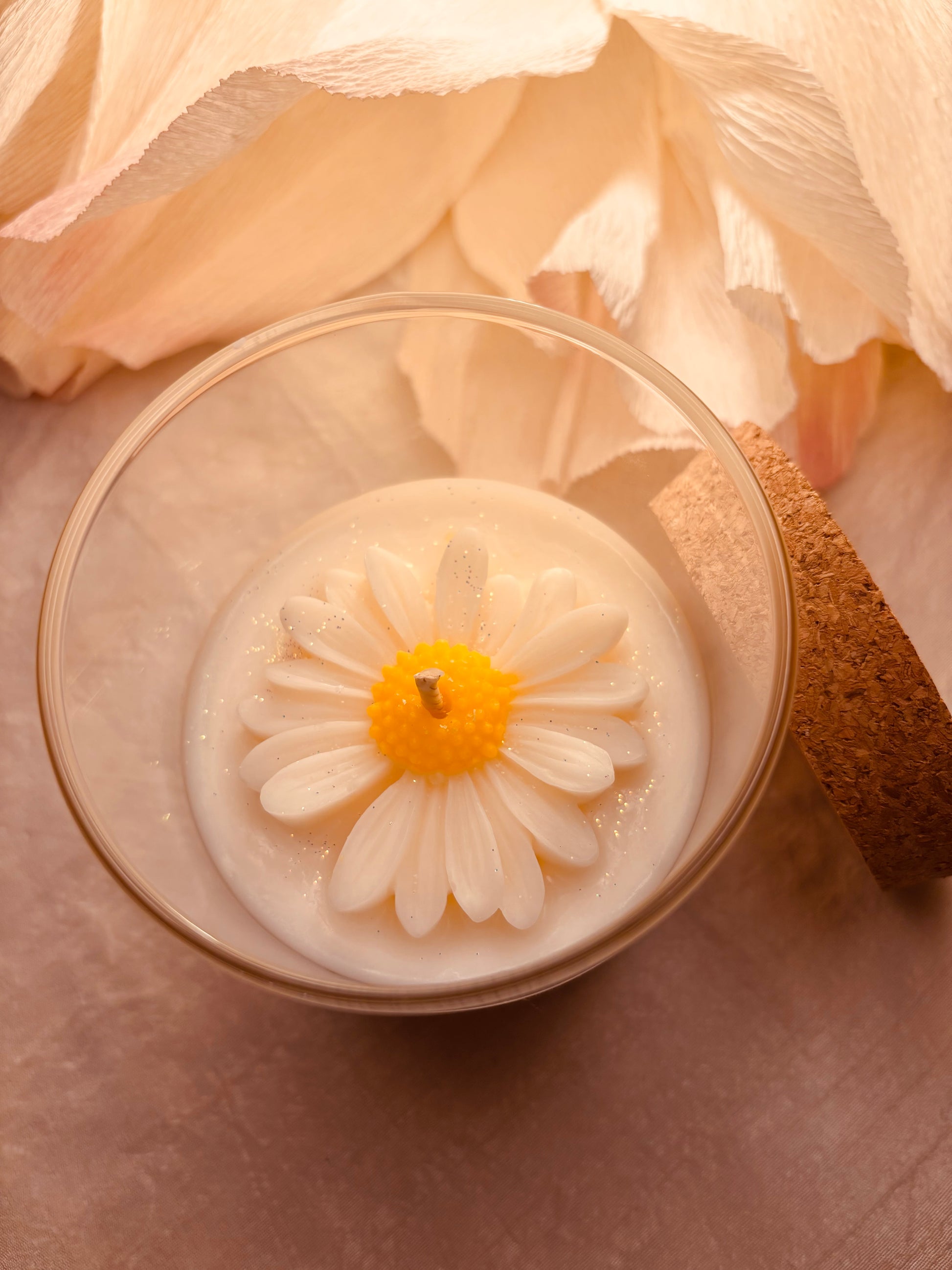 Sulla superficie è delicatamente posata una margherita decorativa, simbolo di purezza e serenità, che rende ogni candela un pezzo unico.