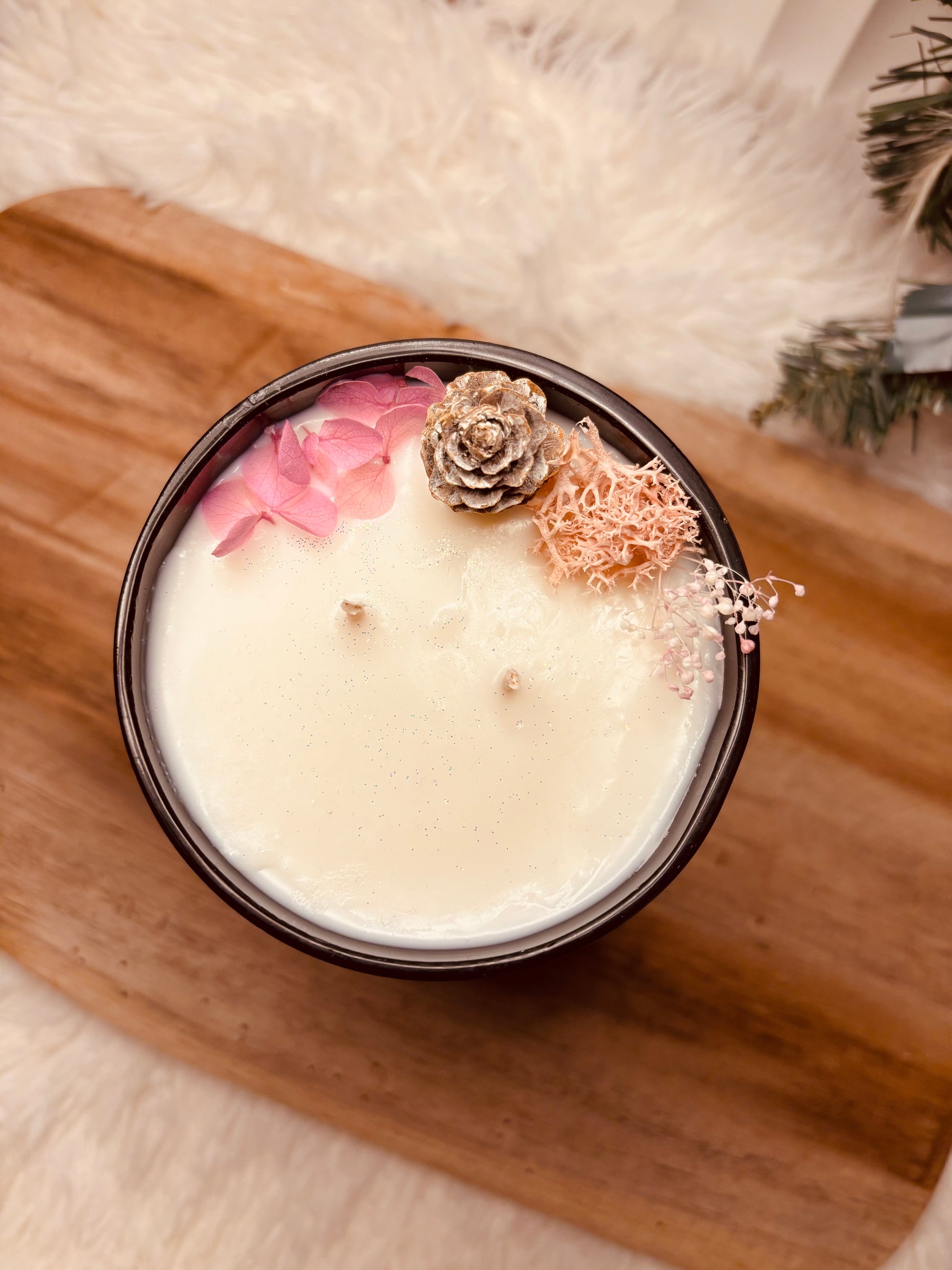 Questa candela è realizzata al 100% in cera di soia vegetale, offrendo una fragranza delicata di latte e miele. Decorata con un fiore, dona eleganza e armonia ai tuoi spazi. Un tocco di classe per ambienti rilassanti.
