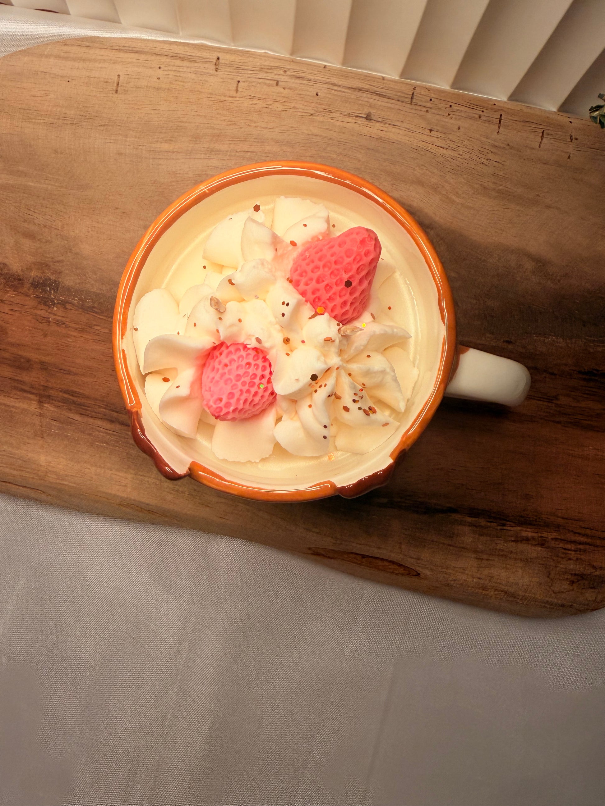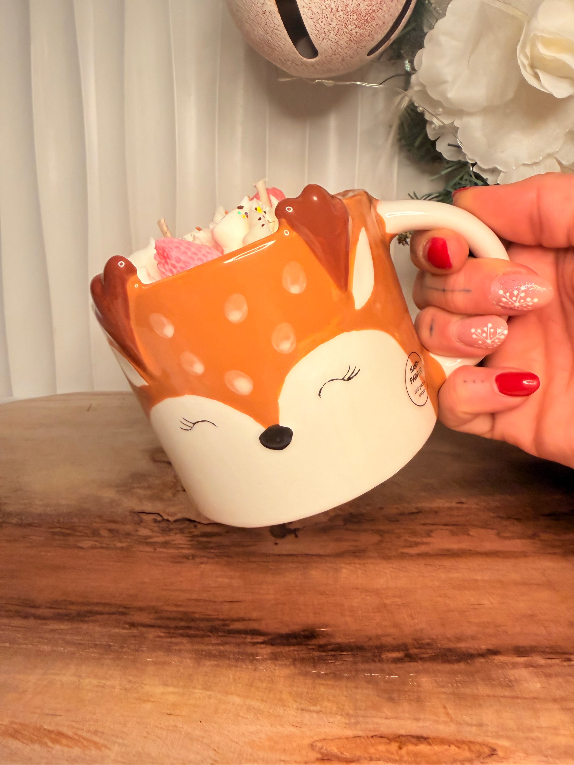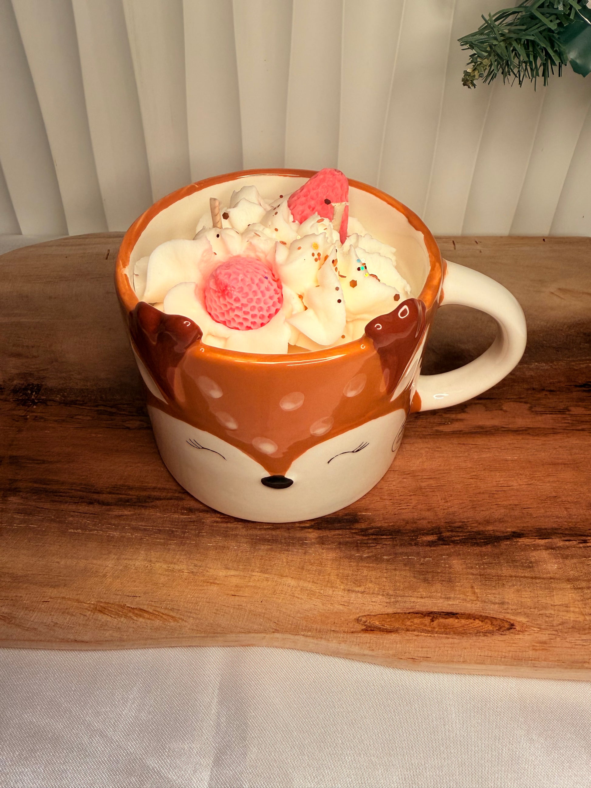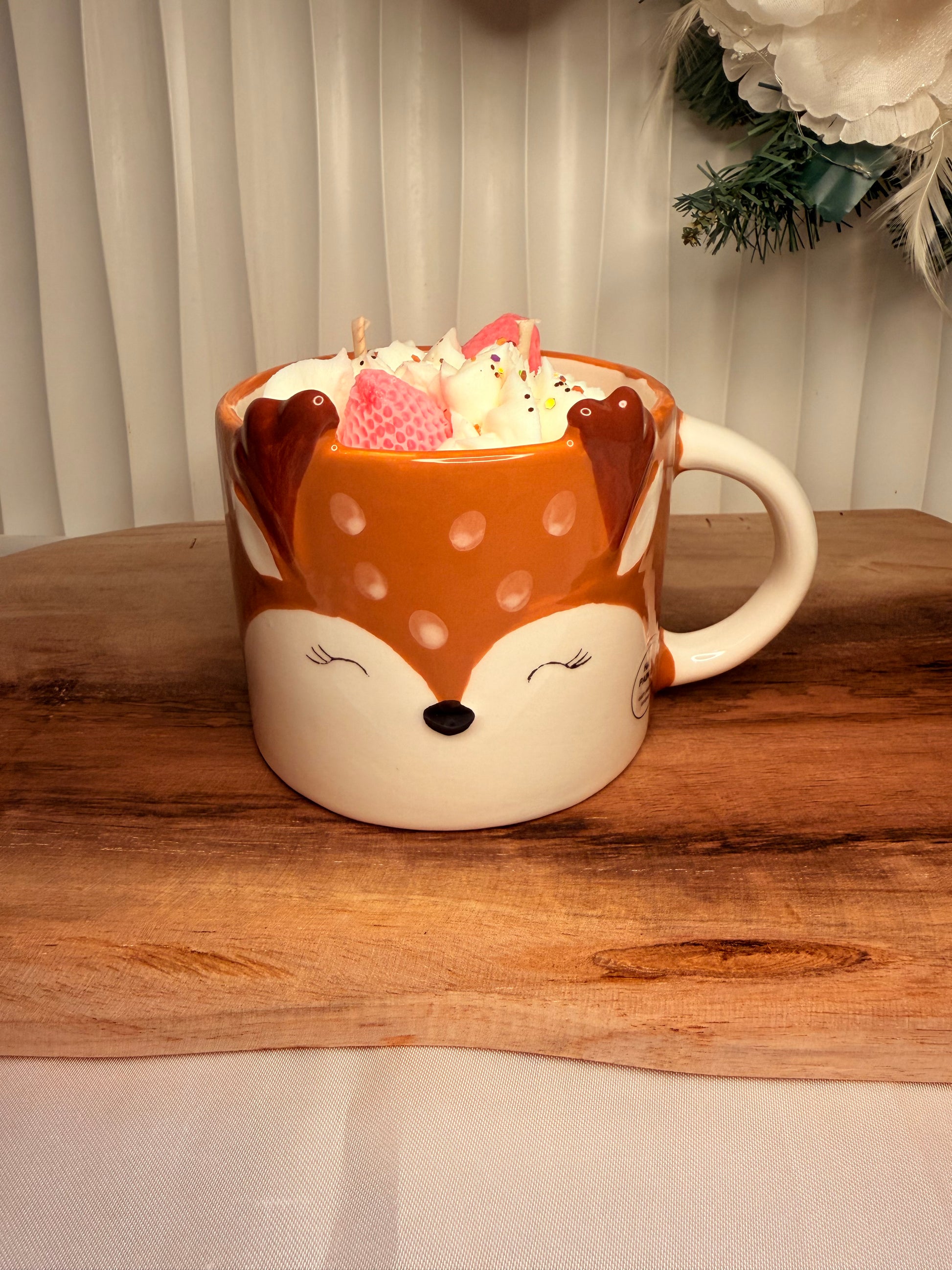 Candela artigianale colata a mano in una tazza riutilizzabile che raffigura un cerbiatto dal design dolce e curato nei dettagli. L’interno è realizzato con tecnica panna montata: una lavorazione morbida e scenografica che ricrea l’effetto dessert, dando volume e tridimensionalità alla superficie.
