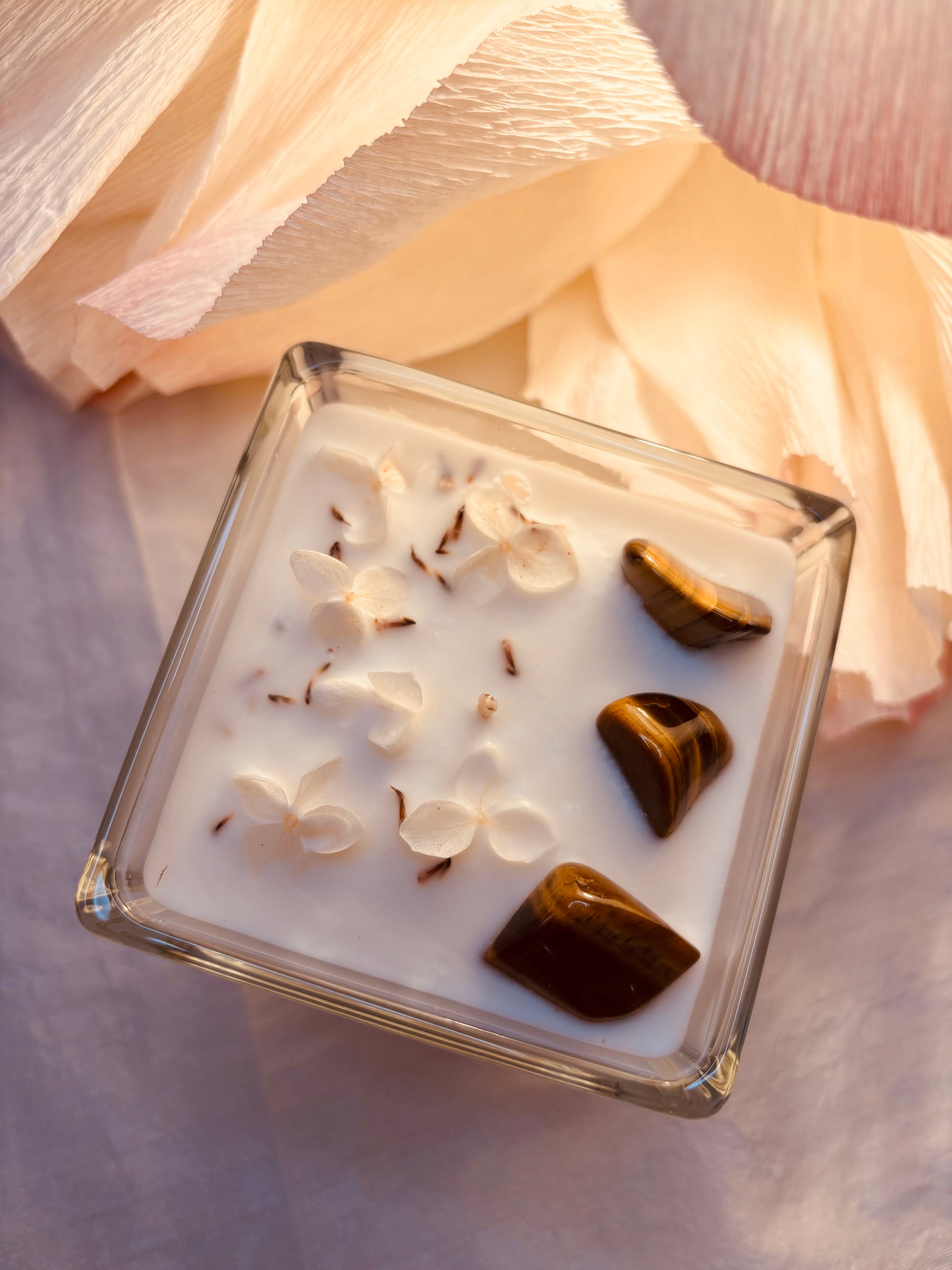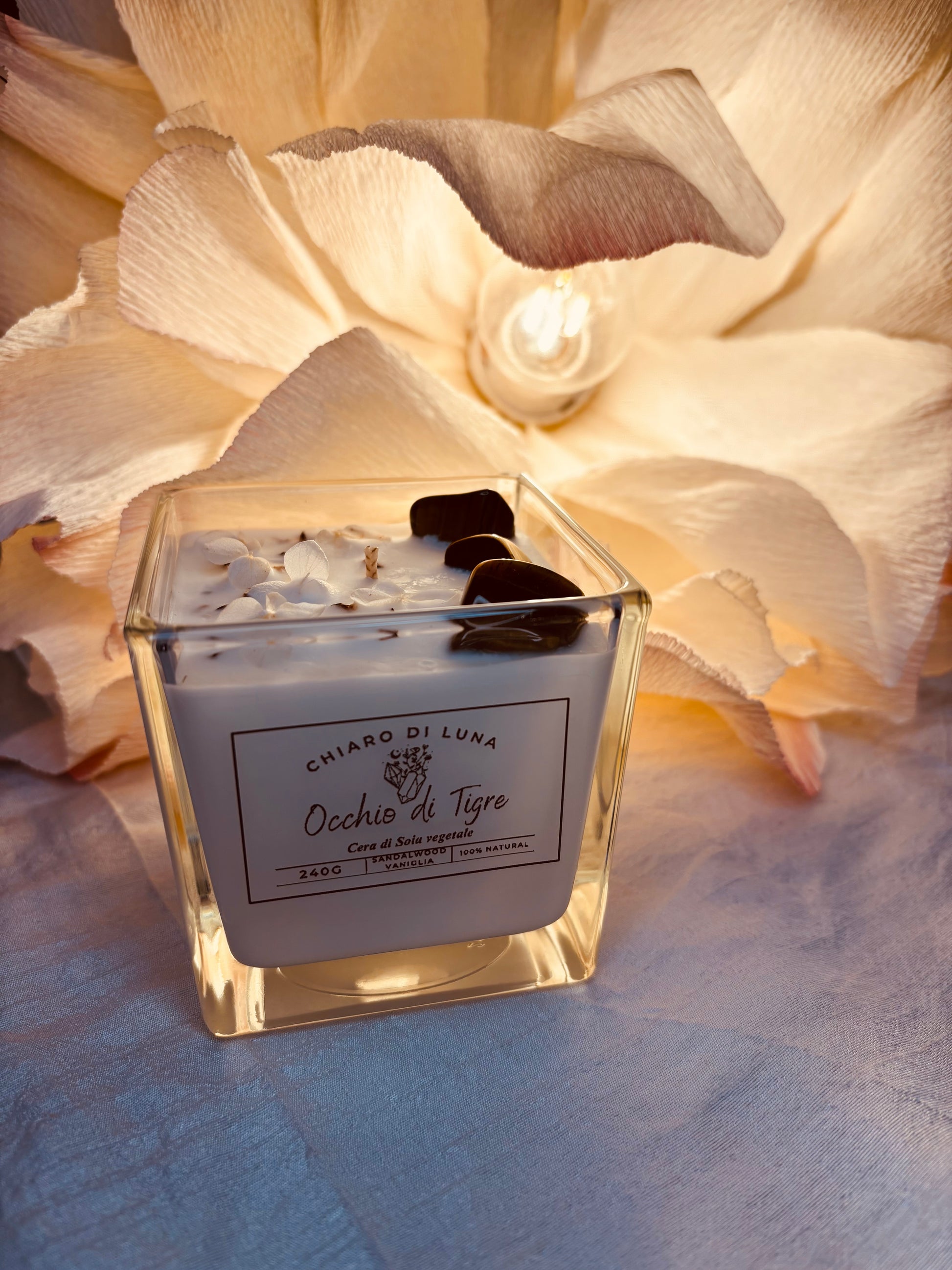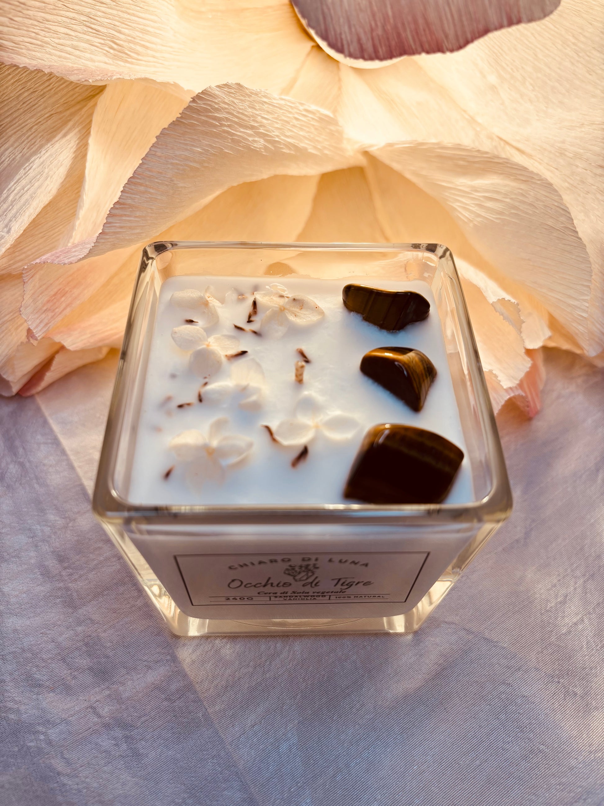 Scopri la Candela Occhio di Tigre, creata a mano in cera di soia naturale e arricchita da cristalli autentici di Occhio di Tigre, selezionati per la loro purezza e vibrazione energetica.