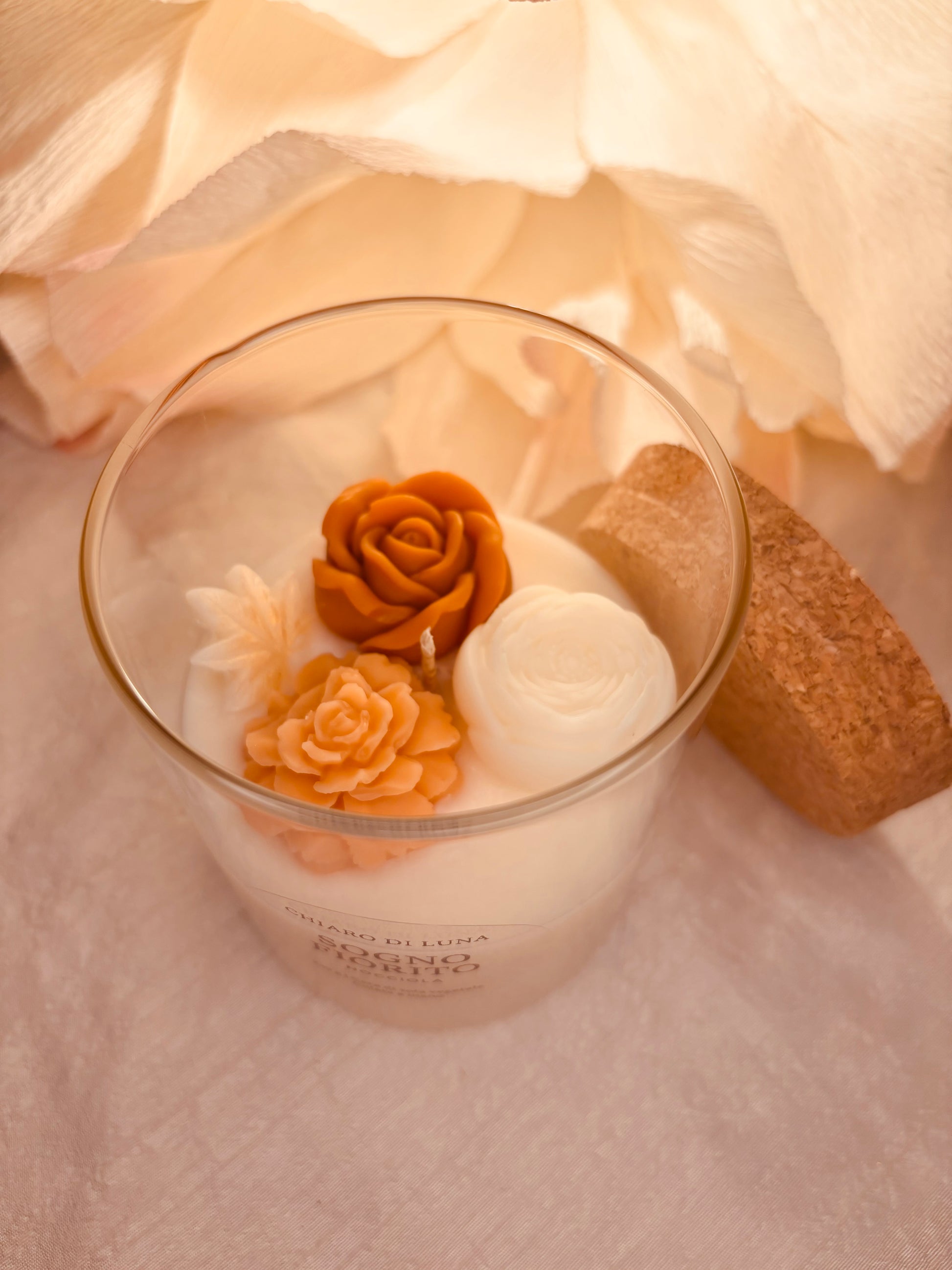 Realizzata a mano in cera di soia vegetale, con veri fiori essiccati, diffonde una luce morbida e naturale che trasforma ogni spazio in un angolo di calma e bellezza.