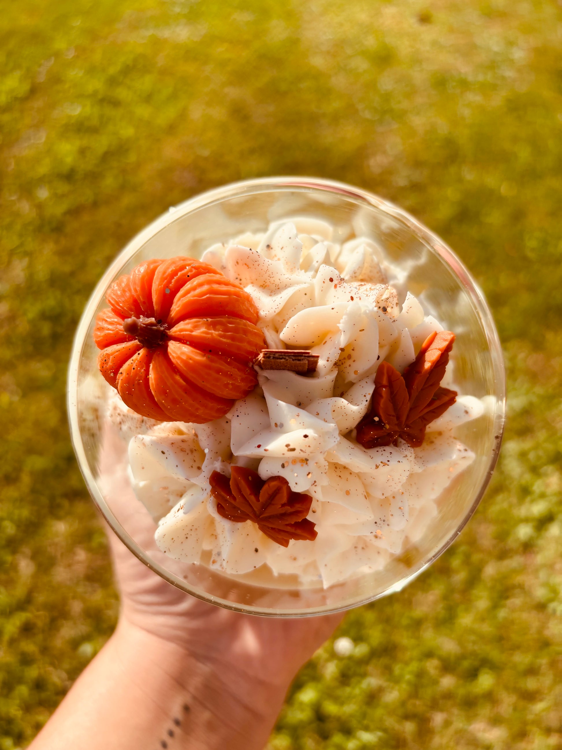 Candela dal delicato profumo di zucca dolce, con particolare effetto di panna montata. Abbellita da zucche e foglie in cera di soia vegetale. Per un'atmosfera calda e avvolgente, perfetta per le serate d'autunno.